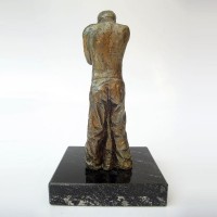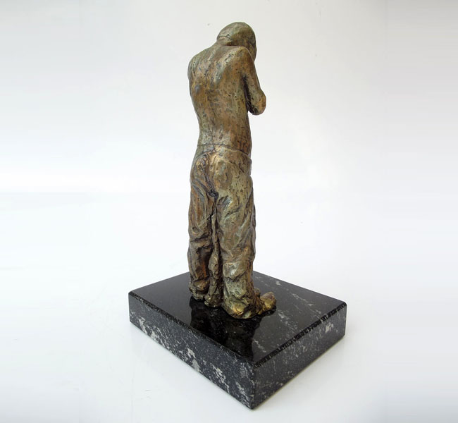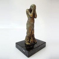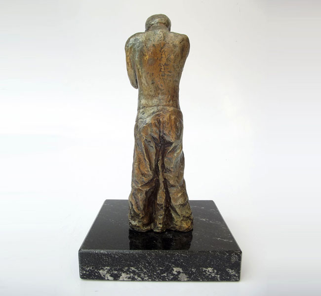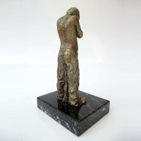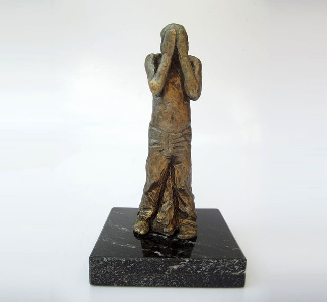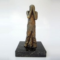 Descrição: Escultura de bronze. Jovem com as mãos sobre o rosto. Fixada sobre base de granito.