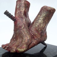 Descrição: Escultura de bronze com vergalhão de ferro, sobre base de granito (peça não fixada). Pátina fria vermelha