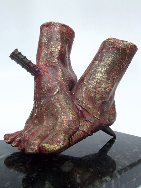 Descrição: Escultura de bronze com vergalhão de ferro, sobre base de granito (peça não fixada). Pátina fria vermelha