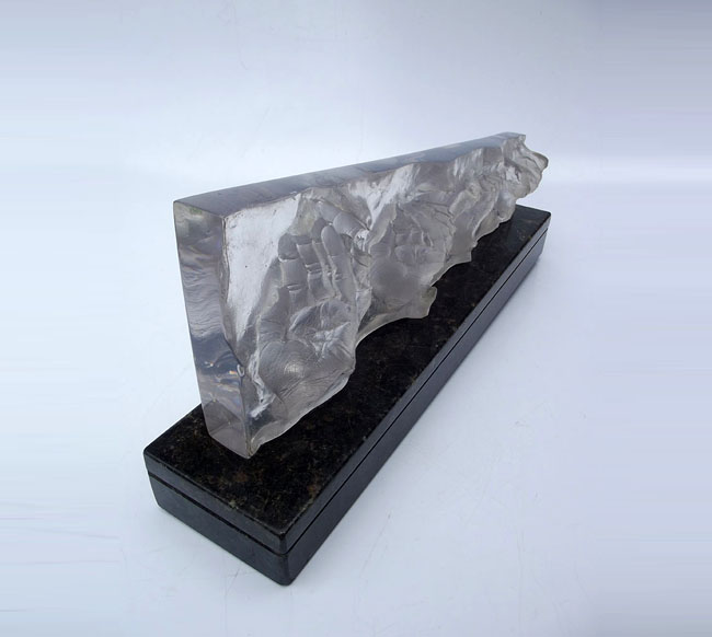 Descrição: Escultura de resina de poliéster cristal, maciça, fixada à base de granito.