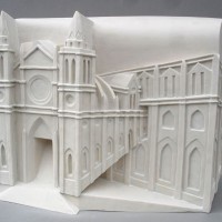 Descrição: Releitura da arquitetura da Catedral Metropolitana de Curitiba. Executada em marmorite, laminada com fibra de vidro. Obra de parede.