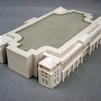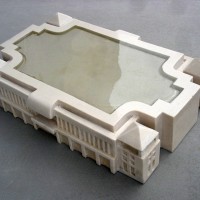 Descrição: Releitura da arquitetura do Parque Tanguá em Curitiba. Executada em marmorite, laminada com fibra de vidro. Obra de mesa.