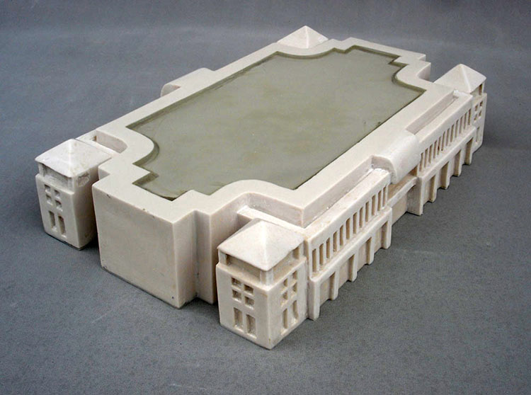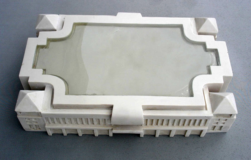 Descrição: Releitura da arquitetura do Parque Tanguá em Curitiba. Executada em marmorite, laminada com fibra de vidro. Obra de mesa.