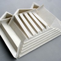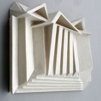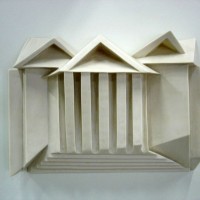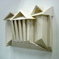Descrição: Releitura da arquitetura da Universidade Federal do Paraná em Curitiba. Executada em marmorite, laminada com fibra de vidro. Obra de parede.