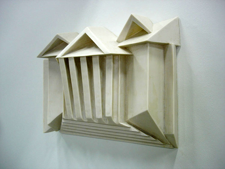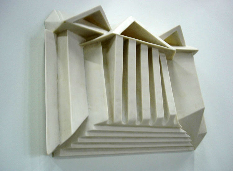 Descrição: Releitura da arquitetura da Universidade Federal do Paraná em Curitiba. Executada em marmorite, laminada com fibra de vidro. Obra de parede.